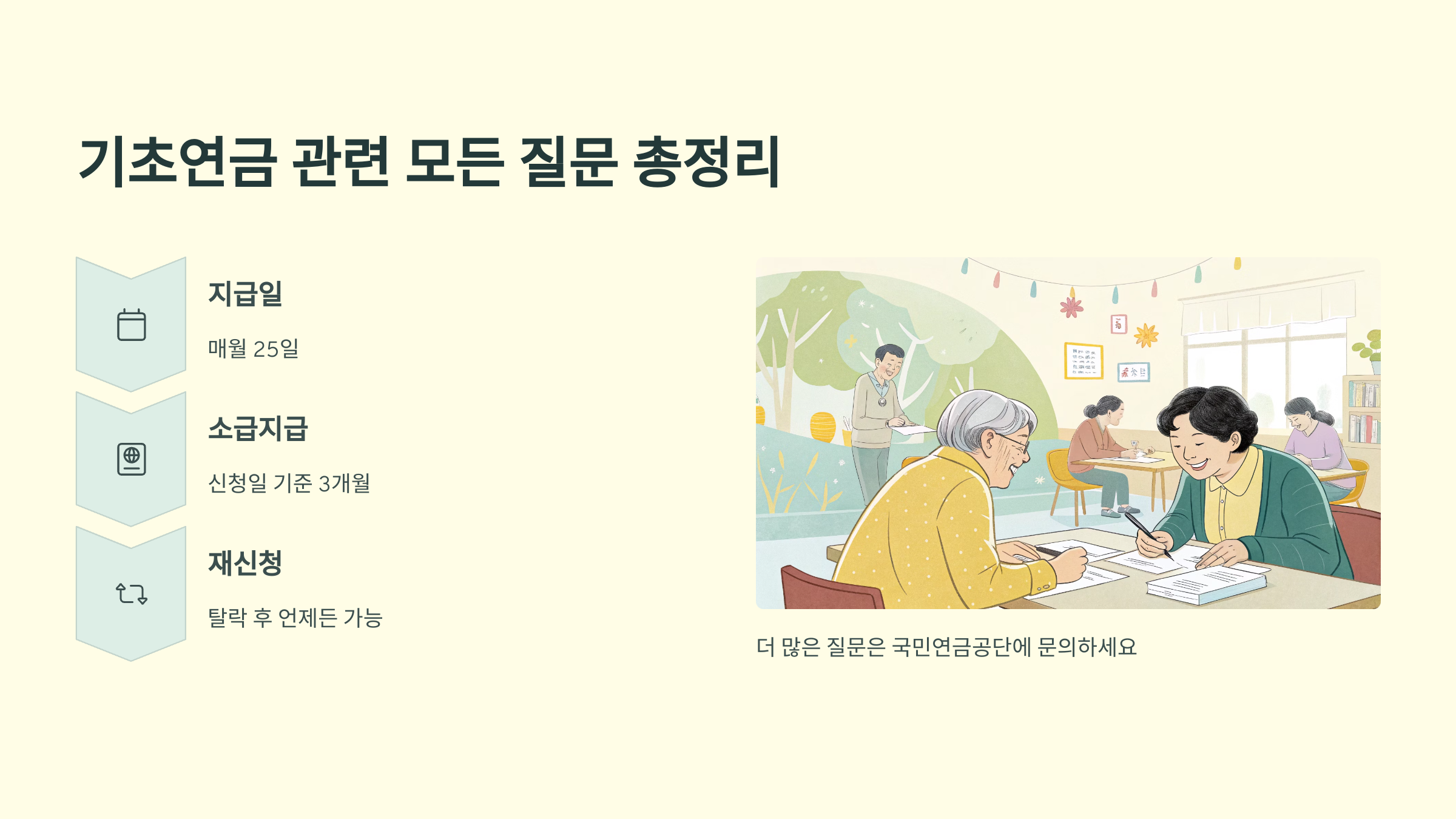 | 국민연금공단 지사/주민센터 | 전문 상담, 상세 안내 | 신분증, 필요 시 소득/재산 서류 |