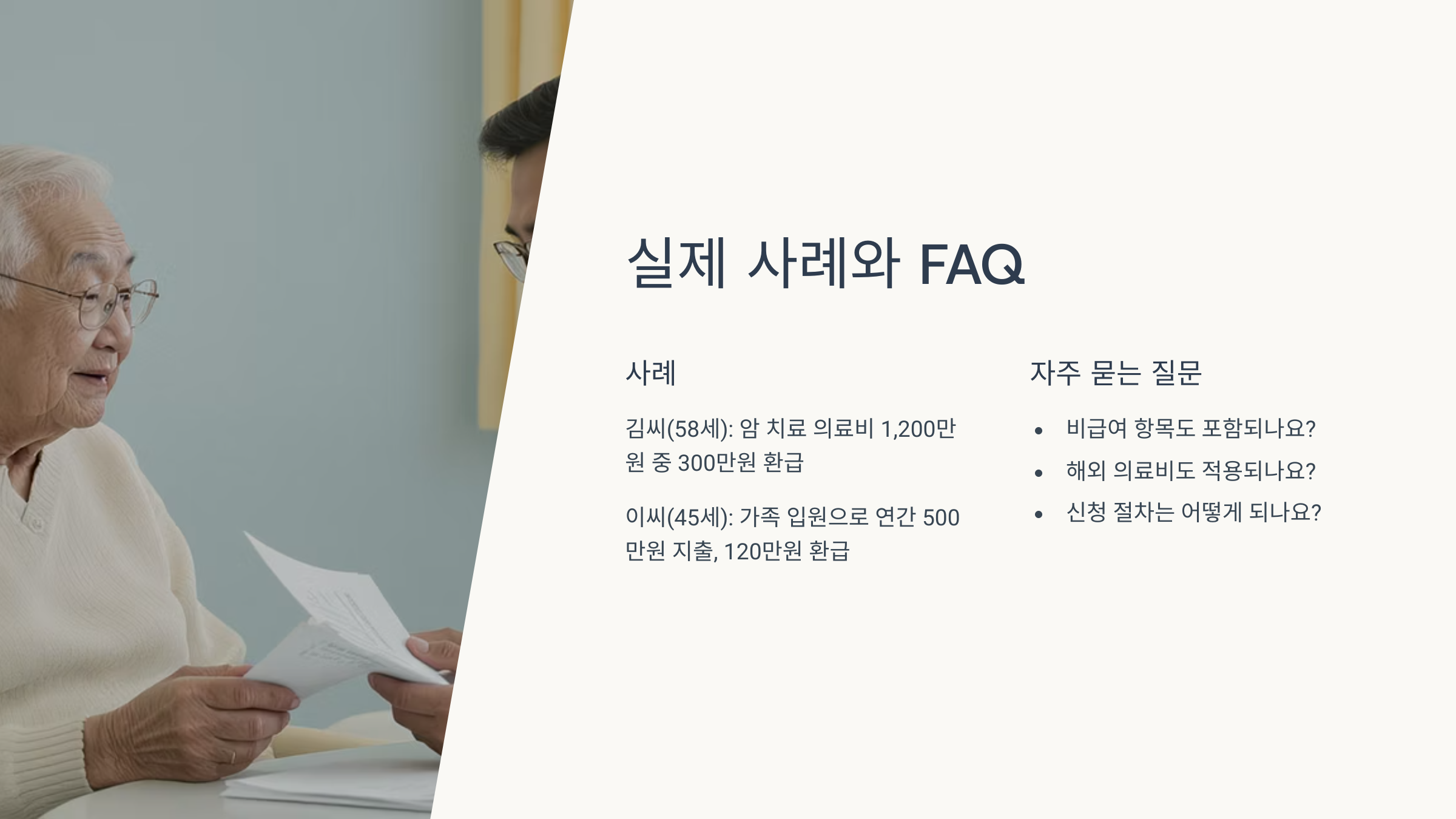 50대 직장인 A씨는 2024년 뇌출혈로 쓰러져 대학병원에서 수술과 입원 치료를 포함하여 총 2,500만원의 의료비가 발생했습니다. 이 중 건강보험 적용 대상인 급여 항목 본인부담금은 800만원이었습니다. A씨의 소득분위는 중위 50%로, 본인부담상한액은 200만원이었습니다. 이 경우 A씨가 실제 부담해야 할 금액은 상한액인 200만원이며, 나머지 600만원(800만원 - 200만원)은 건강보험공단에서 환급해 주었습니다. A씨는 덕분에 치료에 집중할 수 있었고, 가계 부담도 크게 덜 수 있었습니다.