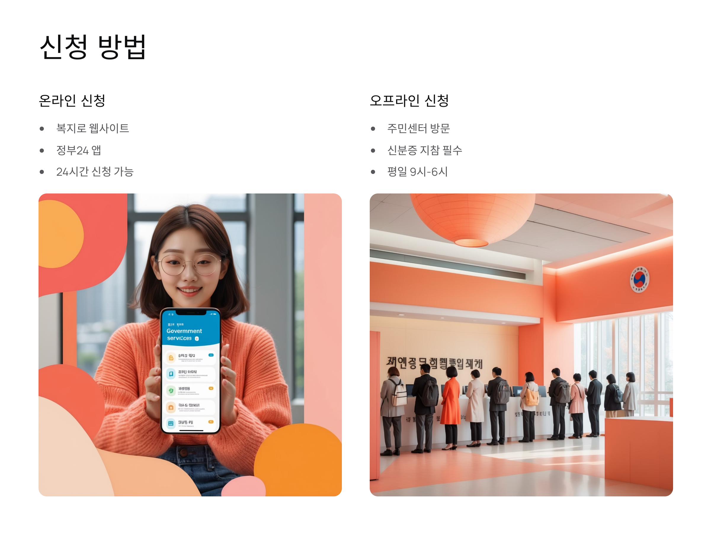 오프라인 신청은 주소지 관할 주민센터 또는 지정된 현장 접수처에서 가능합니다. 신분증과 주민등록등본 등 필수 서류를 지참하고 방문하여 담당 공무원의 안내에 따라 신청서를 작성하면 됩니다. 고령자나 디지털 기기 사용에 어려움이 있는 분들에게 유용한 방법입니다. 현장 방문 시 혼잡을 피하기 위해 사전 예약제를 운영할 수도 있습니다.