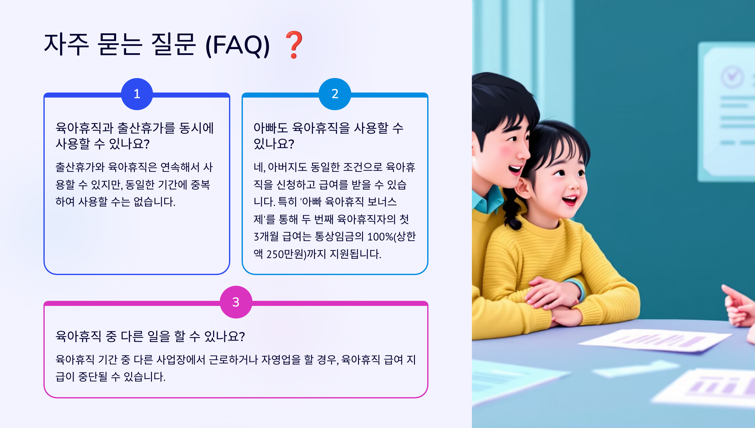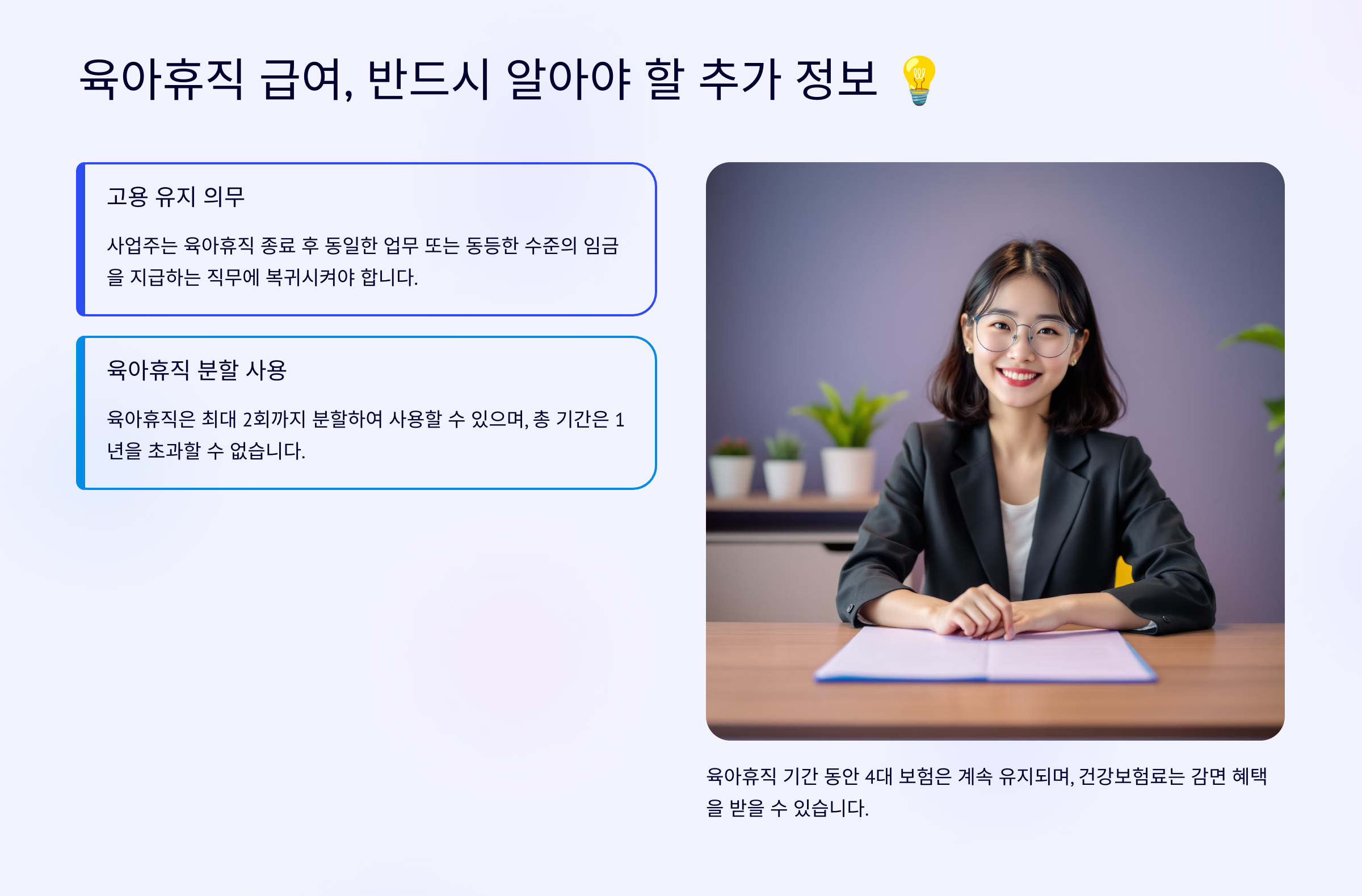 육아휴직 급여는 단순히 금액을 받는 것을 넘어, 근로자의 권리 보호와 복직 후의 지원까지 아우르는 포괄적인 제도입니다. 이외에도 알아두면 유용한 몇 가지 추가 정보들이 있습니다. 이를 통해 육아휴직을 더욱 현명하게 활용하고, 발생할 수 있는 문제에 대비할 수 있습니다.