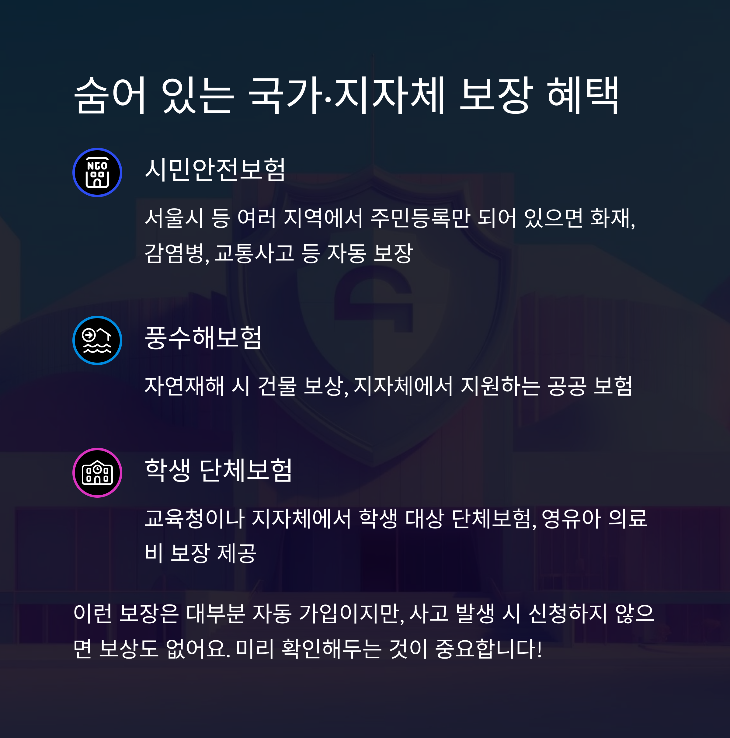 보험이라고 하면 민간 보험만 떠오르지만, 사실 우리 모르게 가입되어 있는 ‘숨은 공공 보장’도 꽤 많아요! 지자체나 정부가 예산으로 마련한 보험은 주민 전체를 자동으로 가입시켜주는 경우도 있답니다. 🏛