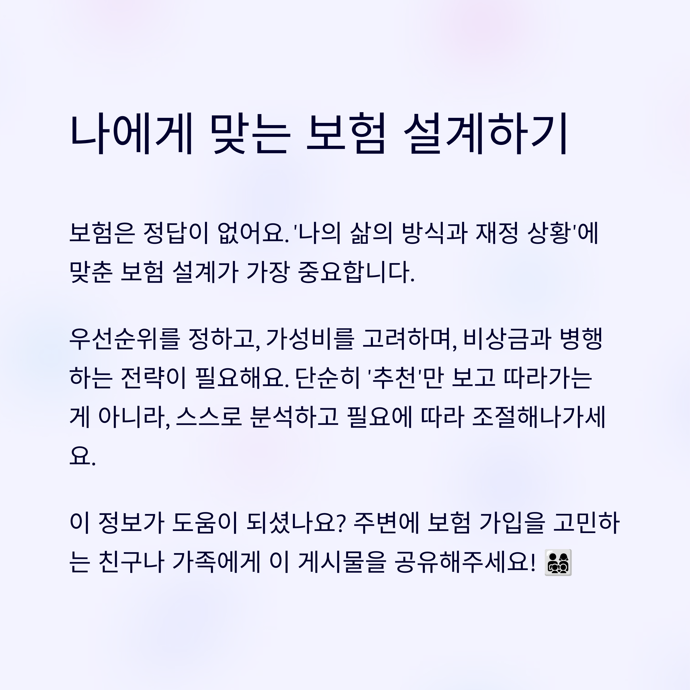 보험은 단순히 '추천'만 보고 따라가는 게 아니라, 스스로 분석하고 필요에 따라 조절해나가는 거예요. 이 과정을 통해 진짜 내게 맞는 보장이 완성된답니다! 💪