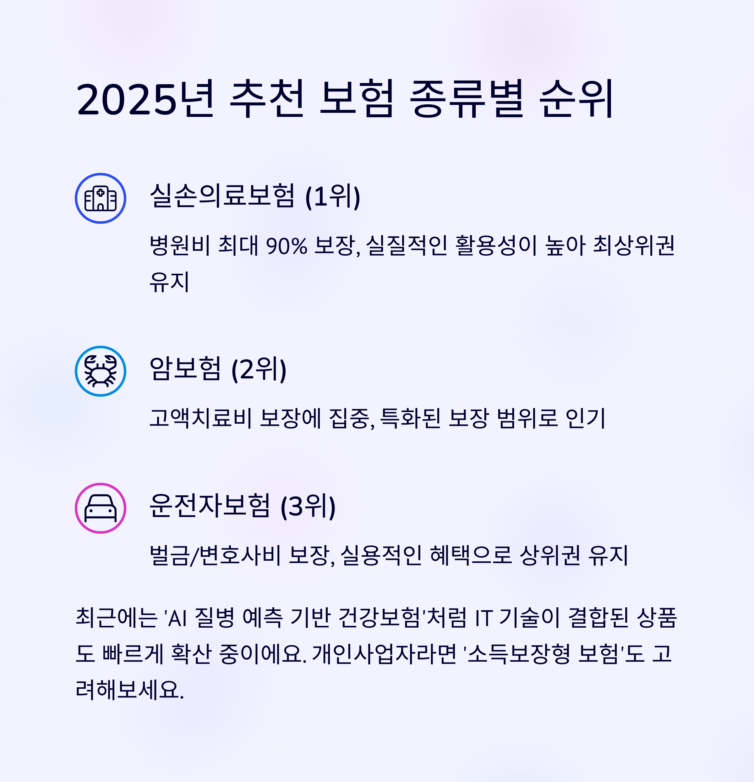 2025년에는 단순한 보장보다도 '실질적인 활용성'이 있는 보험이 인기를 끌고 있어요. 예를 들면, 병원비 부담을 실질적으로 줄여주는 실손의료보험이 여전히 최상위권이에요. 여기에 암보험, 종신보험, 운전자보험 등이 뒤를 잇고 있죠.