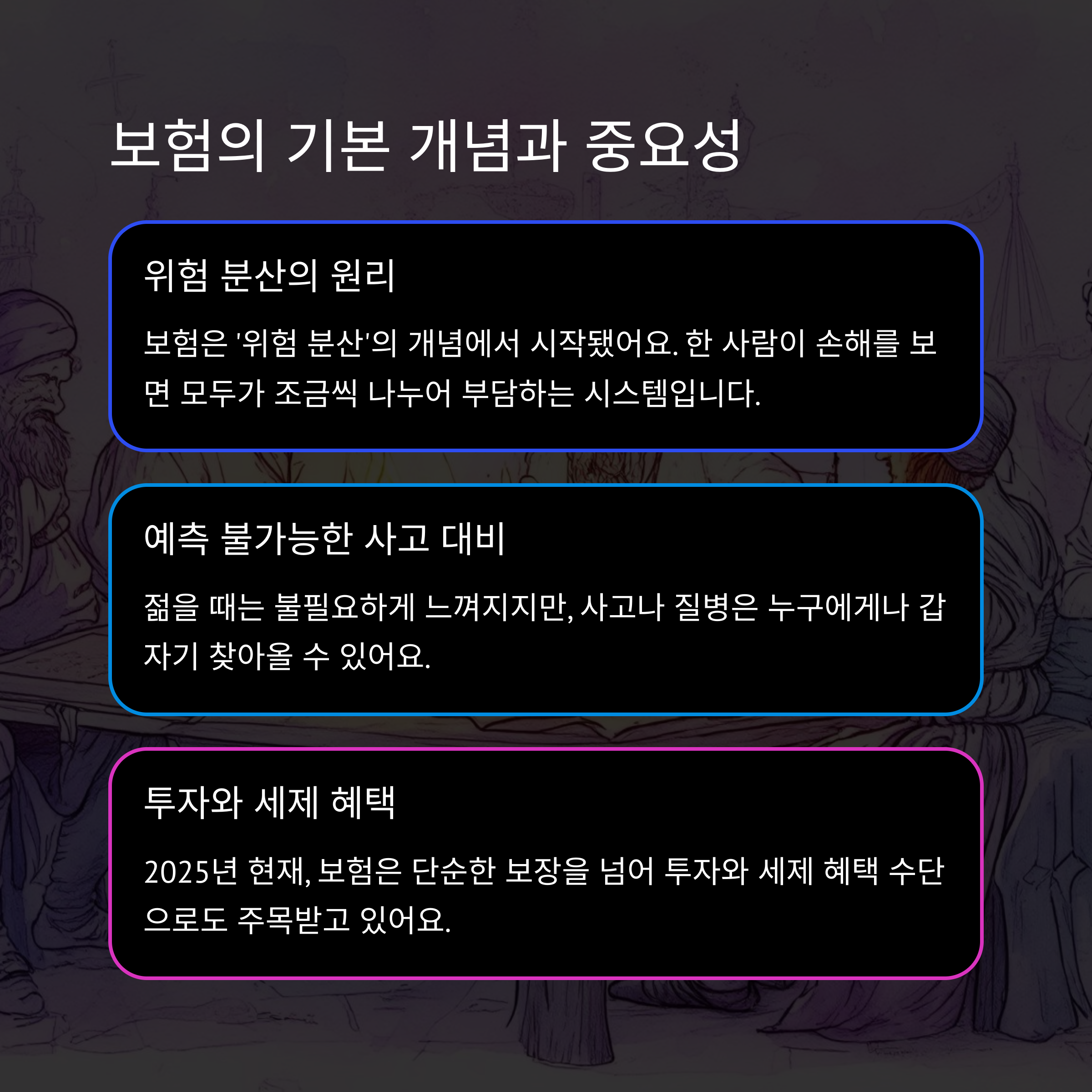 보험은 '위험 분산'의 개념에서 시작됐어요. 아주 오래 전부터 사람들은 서로 돕기 위해 공동기금을 만들었고, 이를 현대적으로 발전시킨 것이 지금의 보험 시스템이에요.