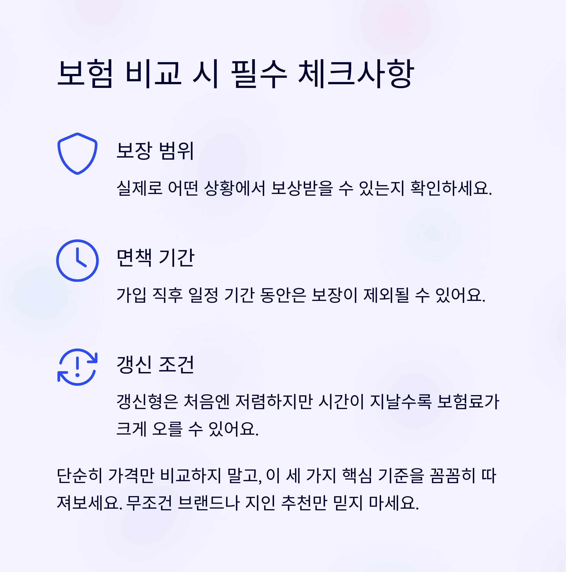 보험을 고를 때는 단순히 가격만 비교하면 안 돼요. 가장 중요한 건 '보장 범위'와 '면책 기간', '갱신 조건'이에요. 이 세 가지는 보험금 청구 시 실제로 보상을 받을 수 있는지 결정하는 핵심 기준이거든요.